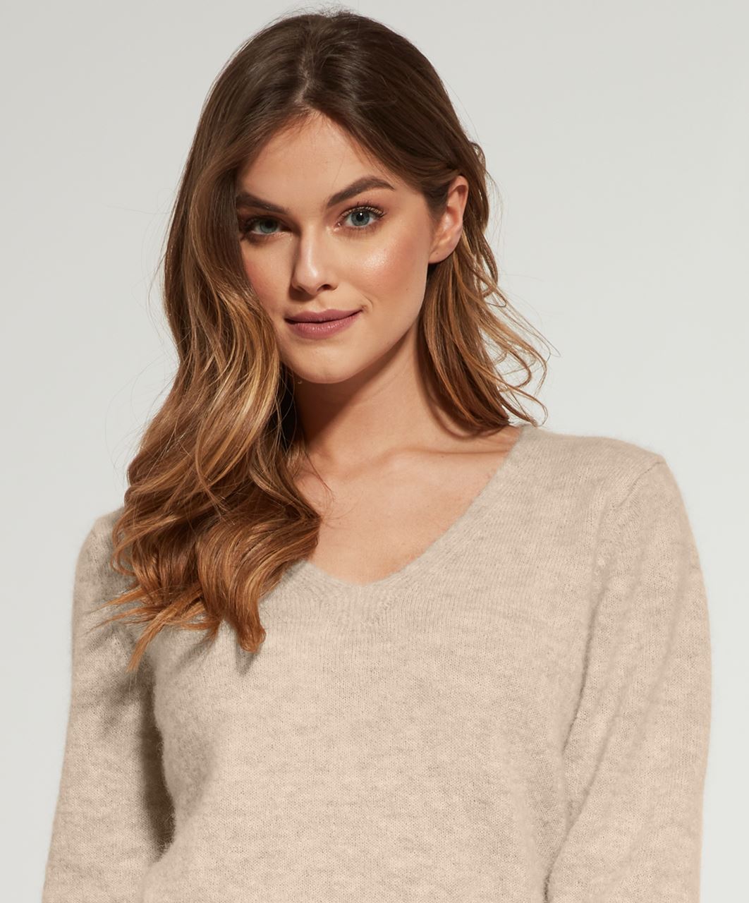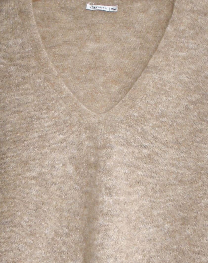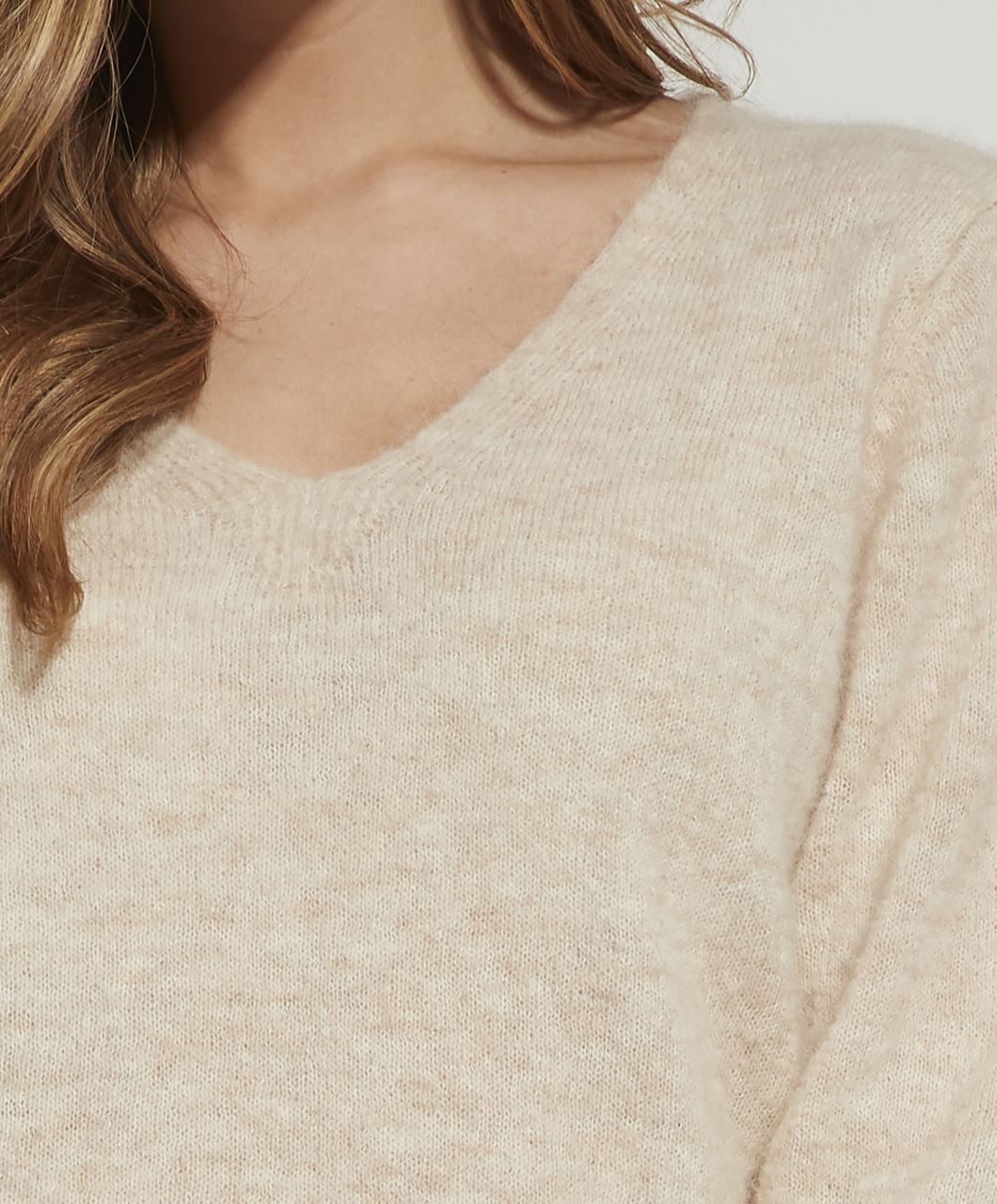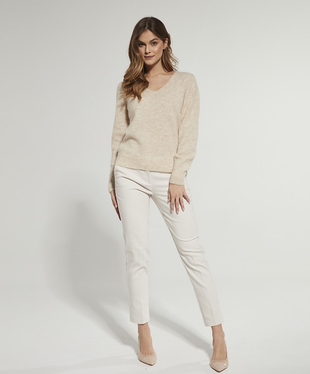 Pulower damski posiada swobodny fason, dekolt V nadają mu swobodnego, a jednocześnie eleganckiego charakteru. Wysokiej jakości dzianina została wykonana z alpaki i wełny merino. Naturalne właściwości alpaki sprawiają, że model jest lekki, a jednocześnie zapewnia przyjemne ciepło w chłodniejsze dni. Alpaka swoją miękkością daje wyjątkowy komfort noszenia.