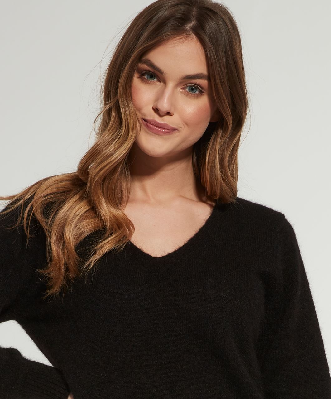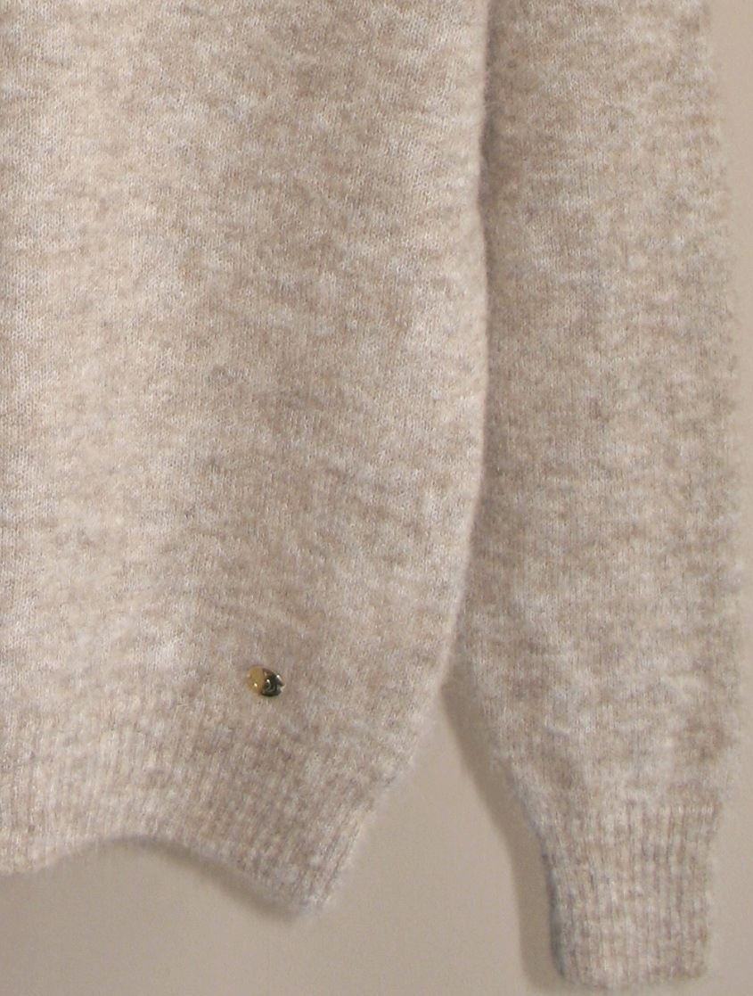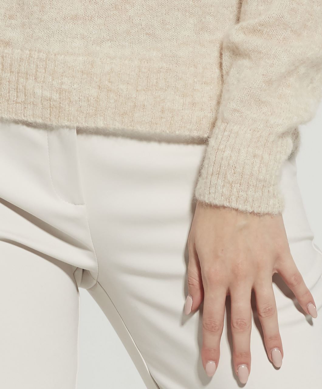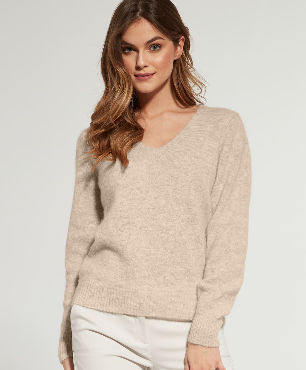 Pulower damski posiada swobodny fason, dekolt V nadają mu swobodnego, a jednocześnie eleganckiego charakteru. Wysokiej jakości dzianina została wykonana z alpaki i wełny merino. Naturalne właściwości alpaki sprawiają, że model jest lekki, a jednocześnie zapewnia przyjemne ciepło w chłodniejsze dni. Alpaka swoją miękkością daje wyjątkowy komfort noszenia.